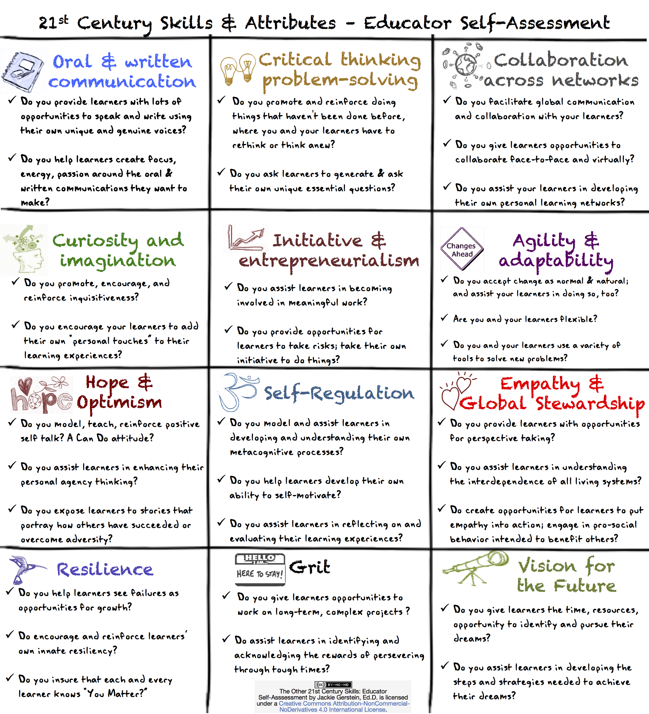 I’ve posted about The Other 21st Skills and Attributes.  This post provides links and resources about these skills as well as an educator self-assessment.  This assessment contains questions to assist the educator in evaluating if and how s/he is facilitating these skills and attributes in the learning environment. skills